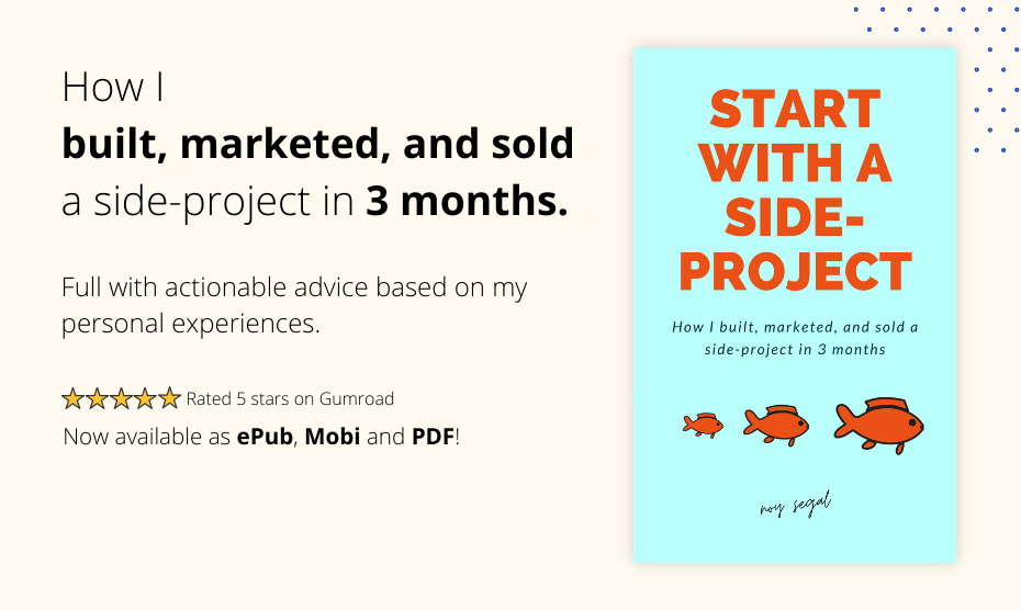 Start With A Side-Project is an ebook that gives you a front-row seat into my hustling journey, as I go through the phases of building, marketing, and eventually selling a side-project within 3 months.