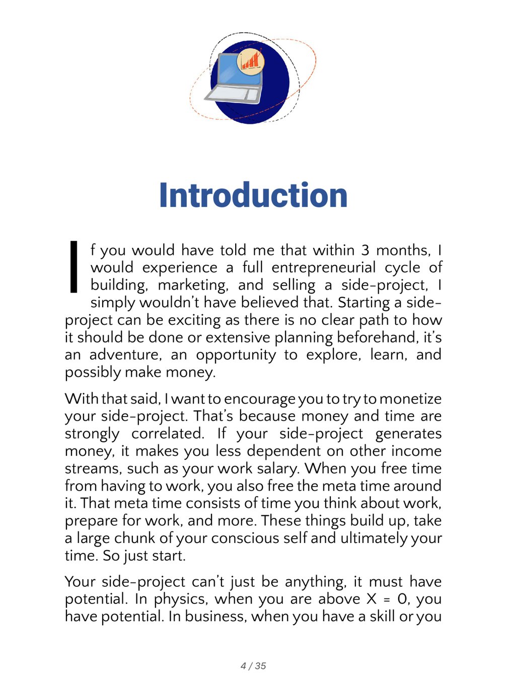 🌱 In this book I want to share with you my personal experiences, thoughts, challenges, and key takeaways of what building, promoting and eventually selling a side-project were actually like for me, and possibly what it could be for you. It will be packed with actionable advice based on my personal experiences.
